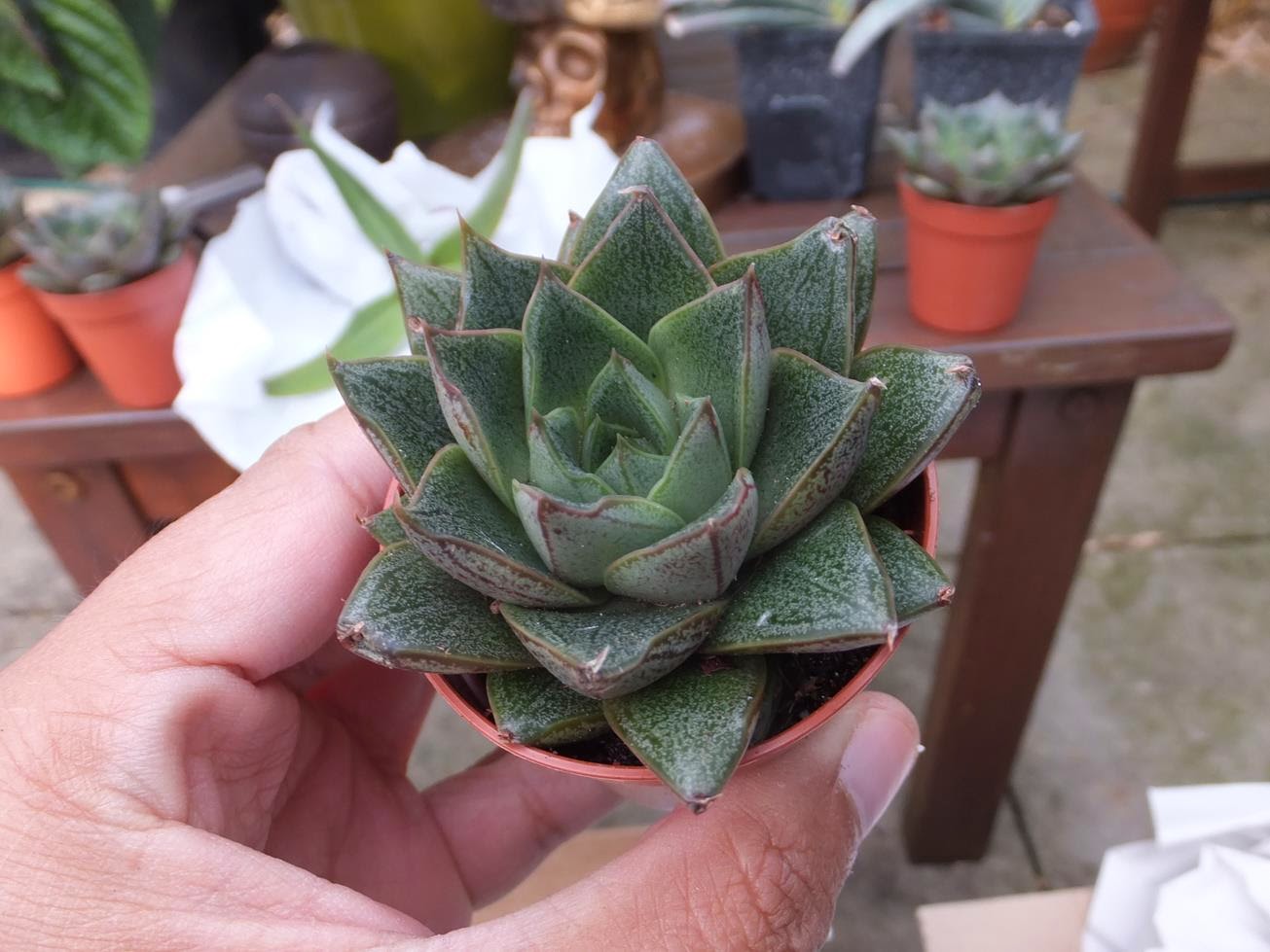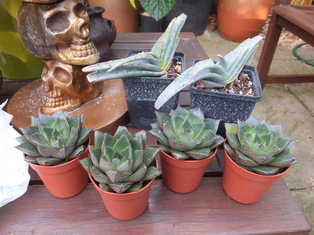 Echeverias are a large group of succulents and there are some of them that I really like. Echeveria purpusorum were on the top of my list so I bought four of them. I also find the Echeveria agavoides group very attractive and a pot full of them do well in our garden so I bought a few more from the group.