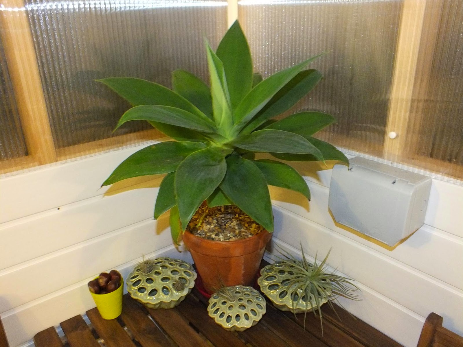 The temperatures in our area have been hovering between +2 to -2C so the mild warmth and shelter of the new shed makes spending more time there than outside extra appealing. We haven't finished moving plants in there yet (we ran out of those coloured bowls) but the Tillandsias that were previously in the jungle hut are already in and enjoying the respite from the cold. Assuming that they are all actually alive still...