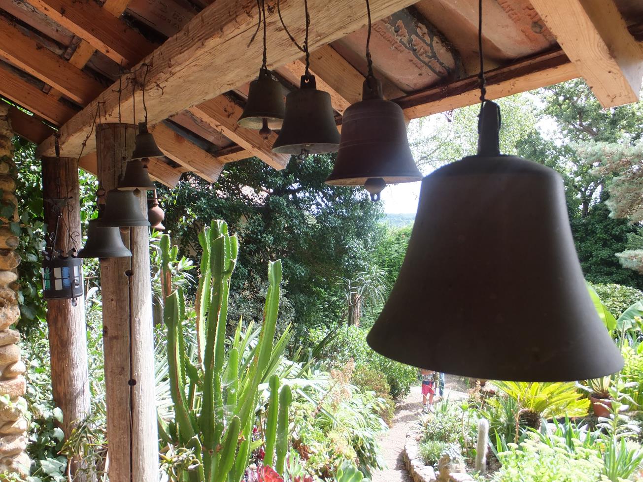I love the selection of bells hanging from this seating area. I think we may borrow this idea for our garden.