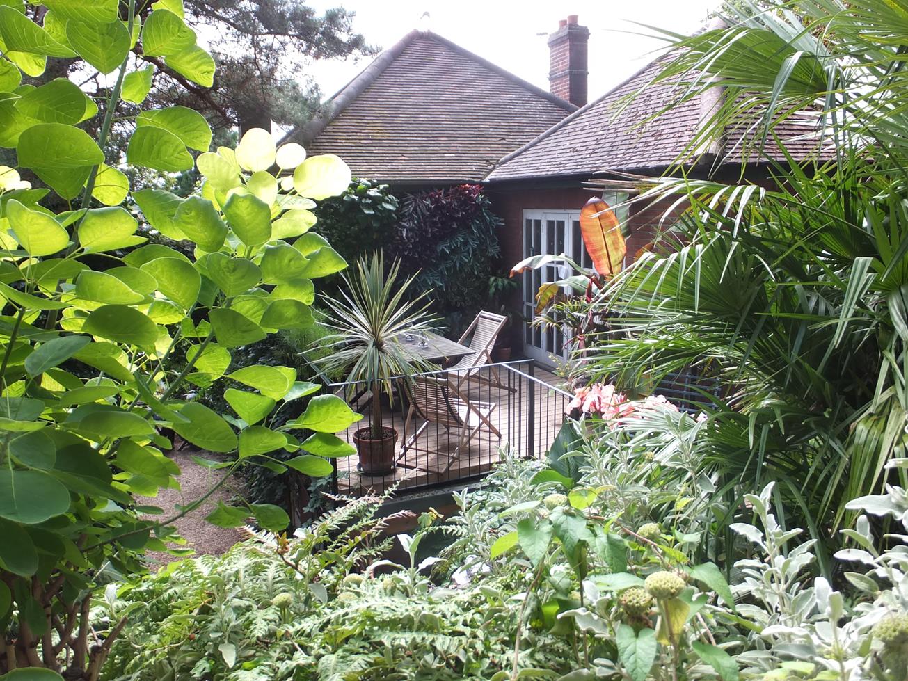 Hard to believe this photo is taken in the centre of Norwich. The house, which appears to be a fairly traditional looking British home, has a balcony and verandah added to the front, which when festooned with jungly climbers and curios transforms the feel of the home.