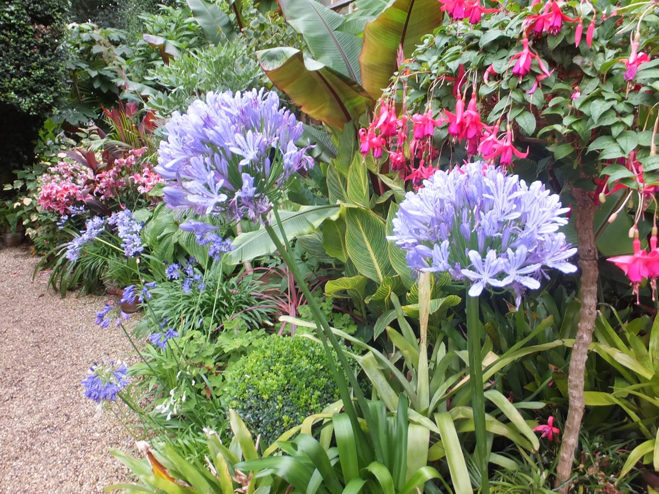 DeleteGaz, it is hard to believe that this garden is located in the UK! What is it with the fascination of the Brits with exotic plants ;-)? I think altogether the creator of this garden has done a great job, although I have to say that some of the color combinations are too bold for my liking. One combo that I do like though is agapanthus together with fuchias. It wouldn't have occurred to me and I also thought the agapanthus like much more sun than fuchias, but in this garden it seemed to work. I also love the different bells arranged by size hanging from the beam.