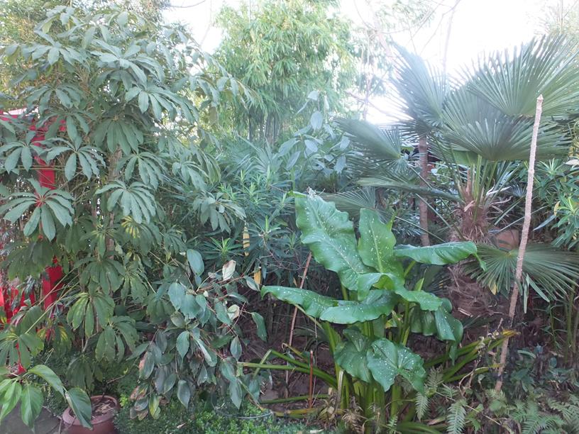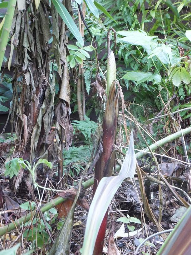 Ensete maurelii planted as summer bedding, pushing out new leaves after November frost