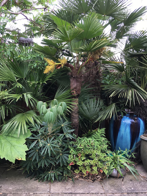 And jumping on to the middle patio, I spotted this Trachycarpus princeps hybrid positively GLOWing as it catches the morning light. Lovely!