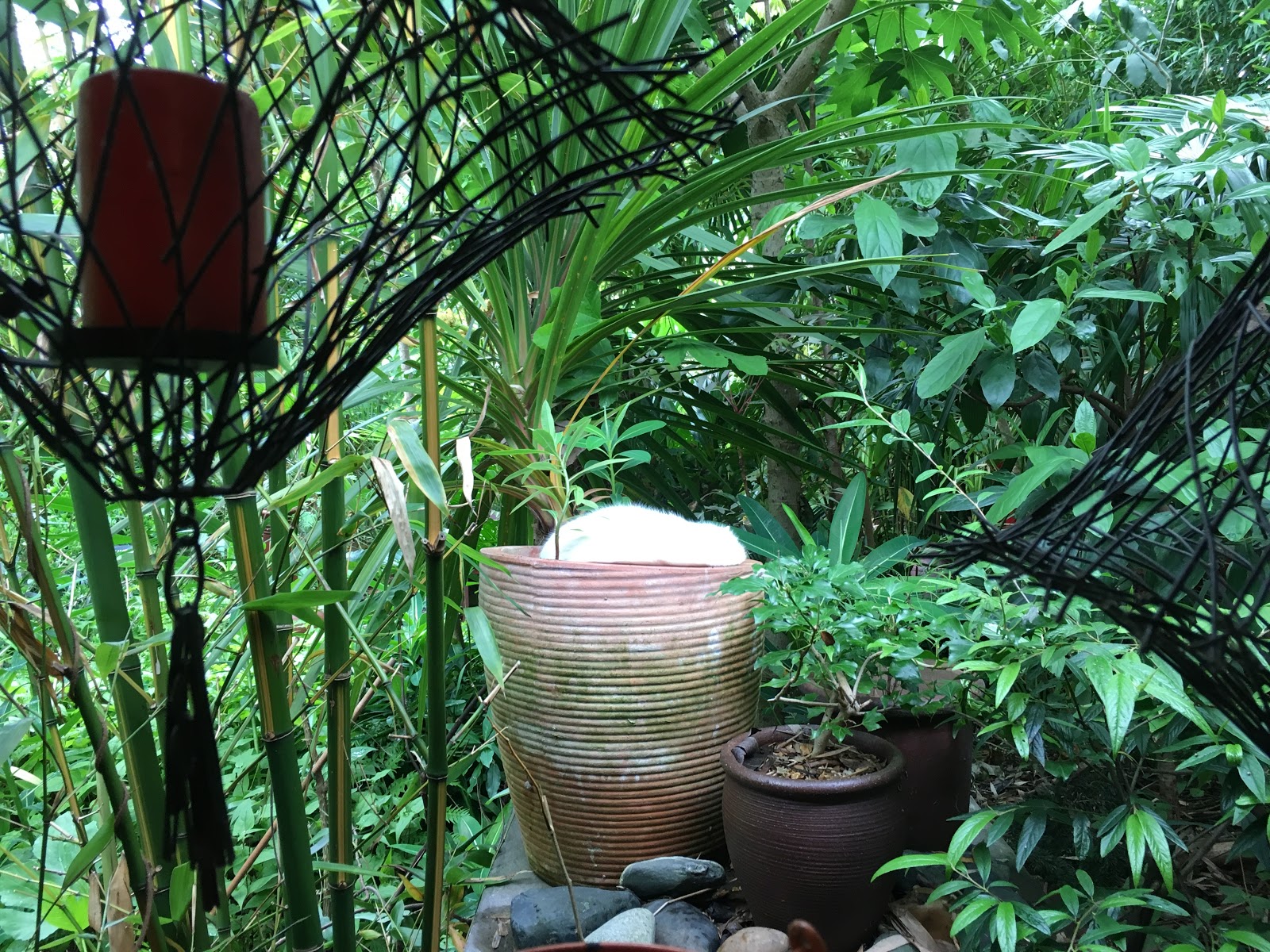 Near the palm above is our Gunnera tinctoria growing robustly and has already rooted over the pond coping stone to dip its feet directly on to the water, helping it grow even bigger and remain upright.
