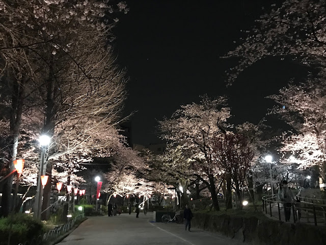 Sensoji is close to Sumida River - a couple of miles upstream from our hotel, and with cherry blossoms, and lights by the river, come people. This was a quieter spot, but still plenty of people enjoying the evening.