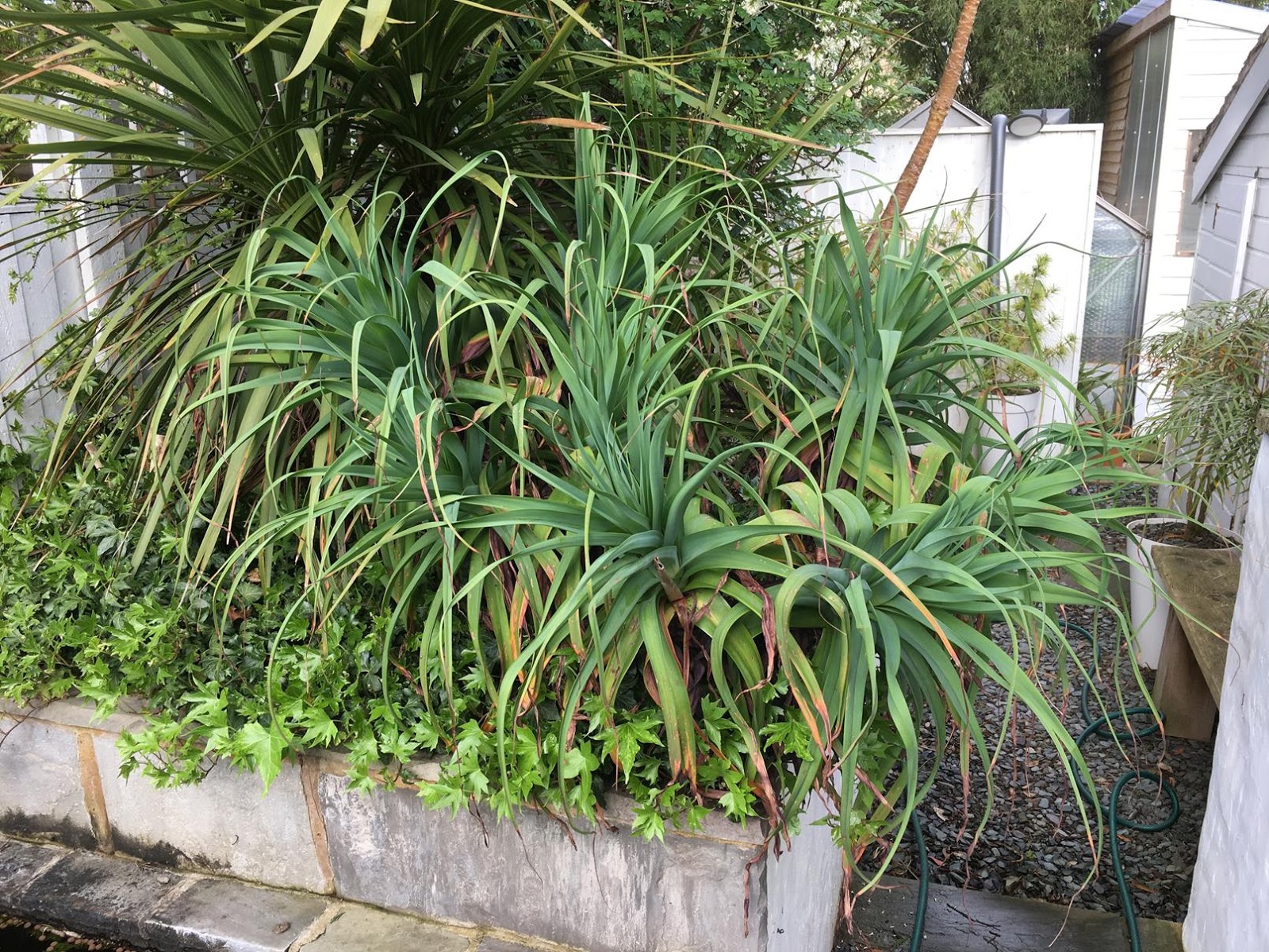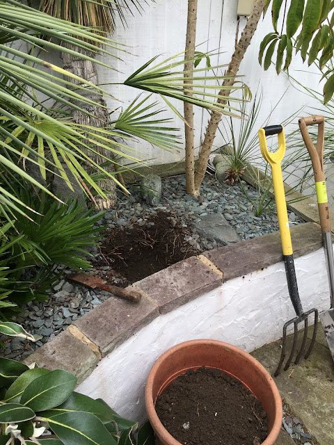 There are several areas in the garden that will need some replanting and plant editing, which includes the first raised bed in the koi pond area. In this bed was a rather sprawling Kniphofia caulescens. It's a good looking poker with blue leaves but they tend to only look good for a couple of months or so. The rest of the year it looks scruffy as it accumulates dead leaves which takes a long time to tidy up, plus the dead leaves seems to harbor aphids in our garden. With time being a premium enough as it is for us, it was time to let it go and be replaced with an equally good looking and much less maintenance plant. And that plant was going to be one of our existing potted Yucca rostrata.