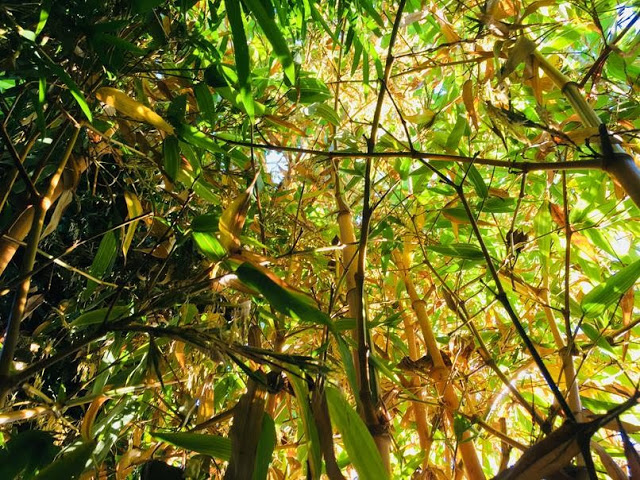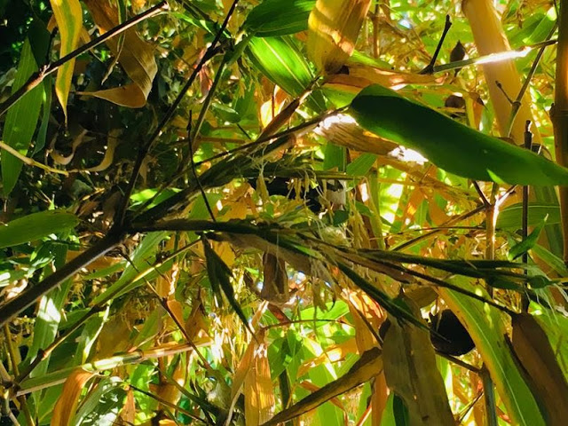 And speaking of demise after flowering, one of my favourite bamboos in the garden, a very slow growing one yet so beautiful with its bright yellow culms with green stripe on its sulcus is flowering...