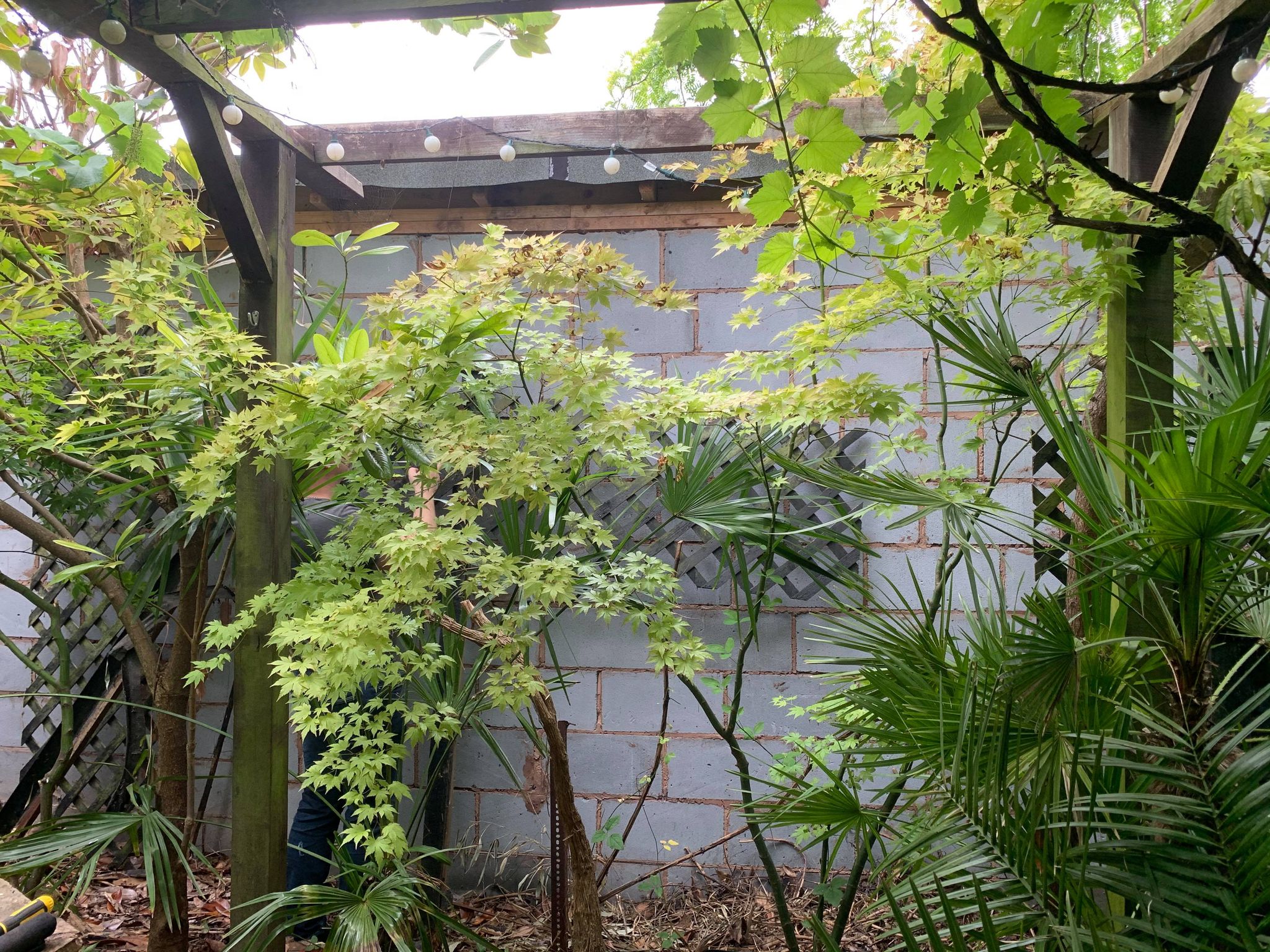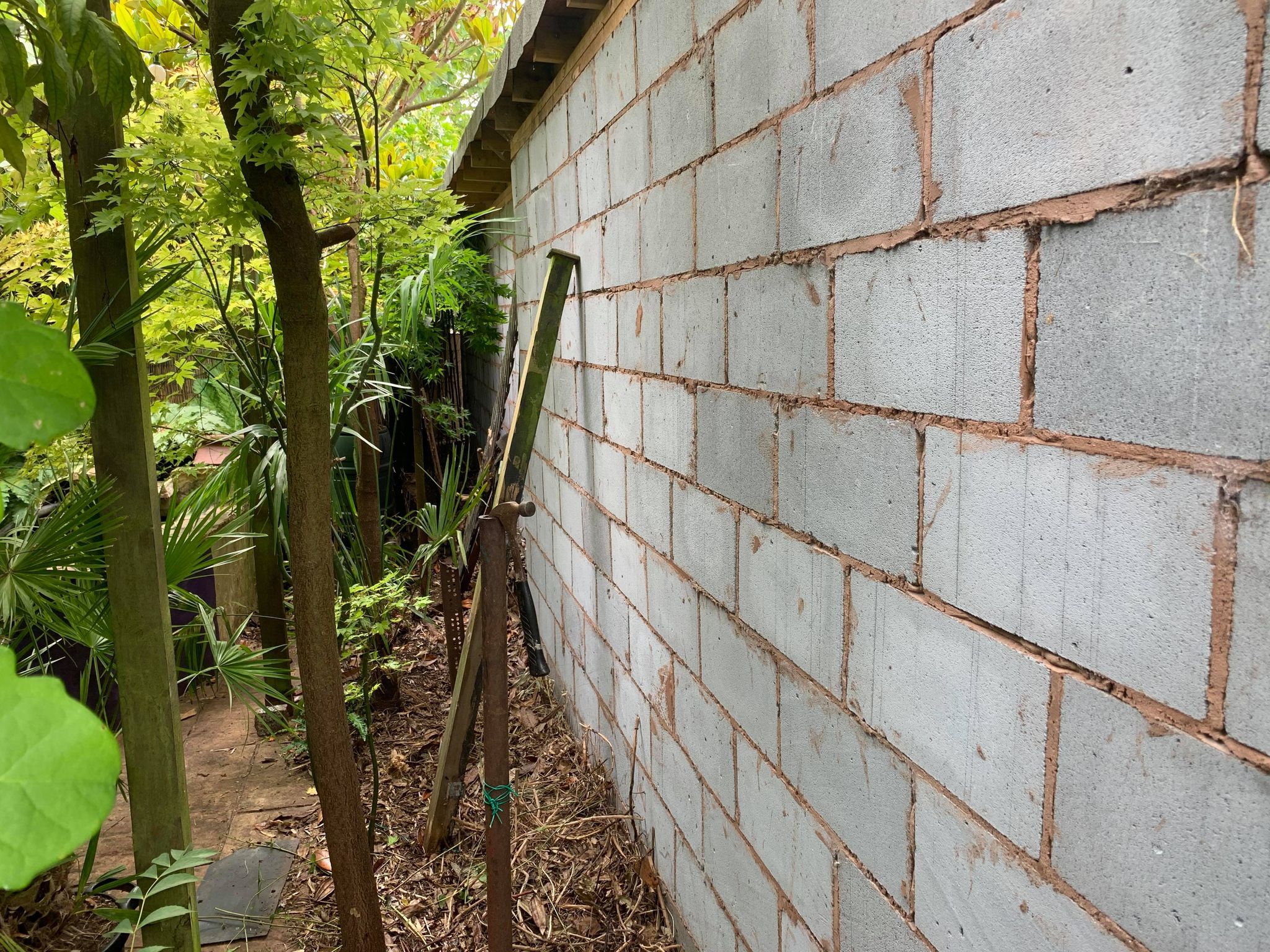 Our neighbour has a large block built shed that provides privacy and shelter, but is not the most attractive feature. But we have plans to change how this is viewed.