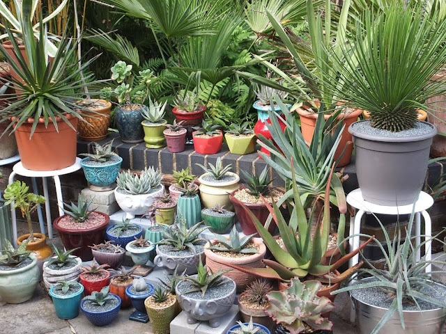 The display above was fun to do, and perhaps quirky enough that it actually made it to a gardening magazine. However, it also made me cringe looking at it shortly after....can't believe I displayed two agaves so prominently in ordinary plastic pots, and to be published too!!