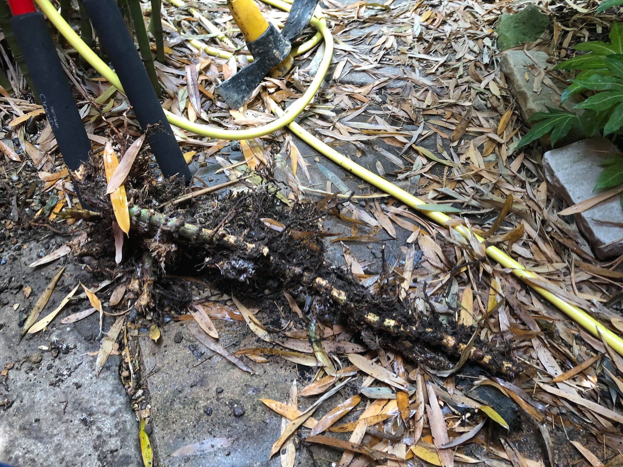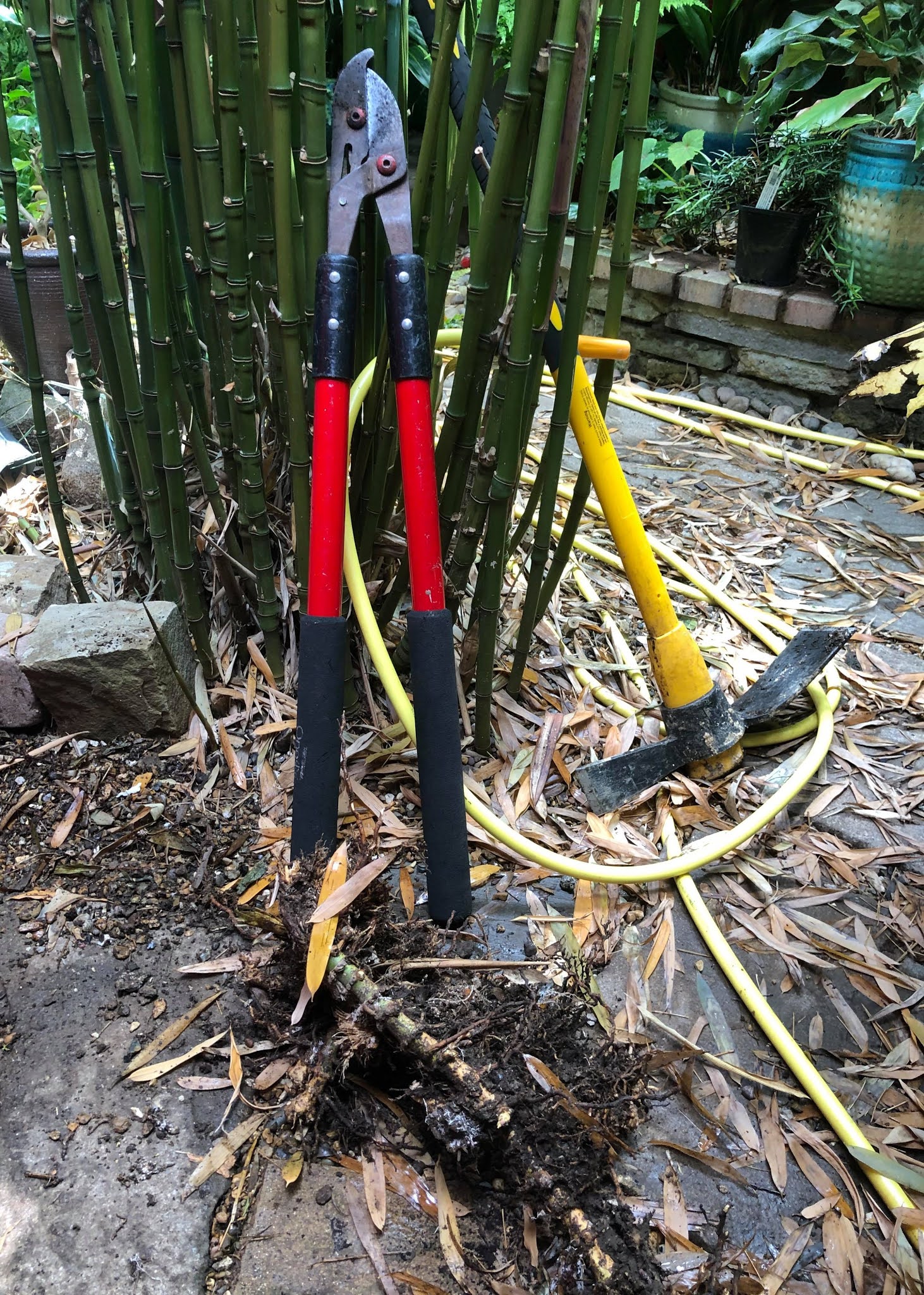 How we went so long in our gardening life without a mattock is anyone's guess, but really it is an essential tool, easily chops through a matted mass of bamboo roots, and helps lift those wayward rhizomes for subsequent disposal.