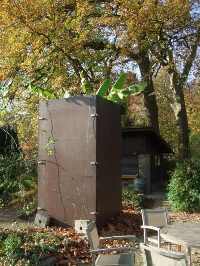 Many of us have to protect plants in winter, but how many have to go to such lengths as these? The plant being protected in the second picture below is easy to work out as it still has leaves poking out of the top (Musa basjoo). However what do you think is being protected by the metal sheeting?
