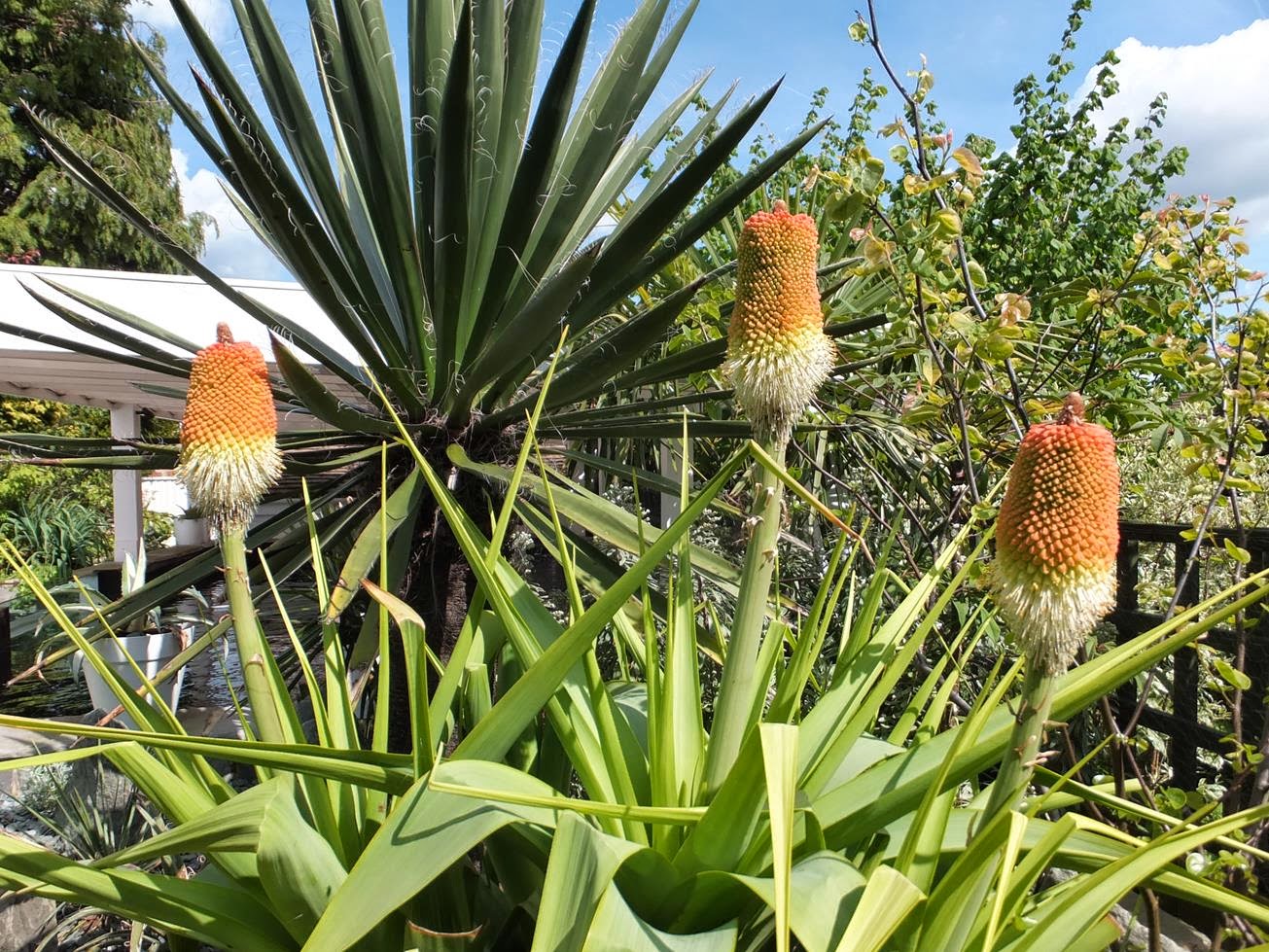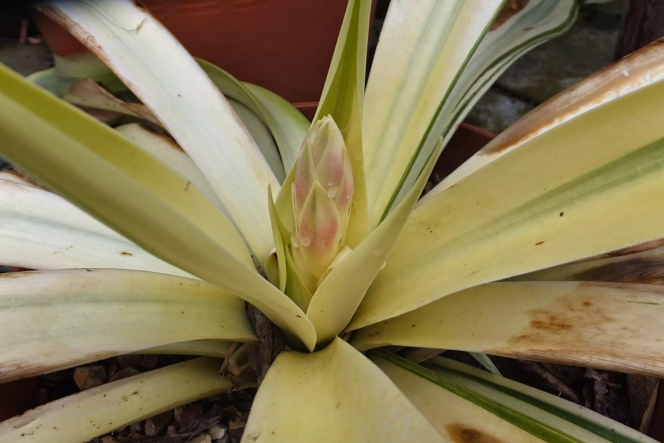 The variegated Beschorneria septentrionalis remained outdoors all winter. Although it sailed through fine it's no longer looking as pristine as it ought to be. Blemished but very much alive. And now it's about to bloom. Hopefully it will send out offsets after.