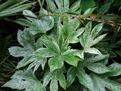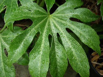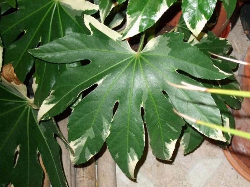 | Fatsia japonica 'Spiders Web' with an unusual "snake skin" variegation, |