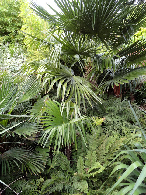 This spot looks to be deep in the middle of a jungle, yet just a few inches to the left hand side is a brick wall, and just beyond the dark green bamboo in the background is the neighbour's fence. Sometimes I don't always look at the plants in the garden individually, this Trachycarpus, for example, has got big almost without me noticing it do so. It was planted as a very small plant from B&Q, if I recall correctly it was about £12 or so back in 2005, so it was quite a baby plant really with hardly any trunk. It was planted with a lot of compost into an area that was once a small pond (liner rather than natural) created by one of the former owners of our house. When we cleared the area and removed the badly damaged liner we filled it in with a lot of compost mixed in with top soil. It had a good start! This area hasn't had many changes made to it since 2005, most of the ferns have been there since then, and only a few additions over the years. Yet now 7 years later the palm is really starting to take off and the local urban environment is completely hidden.