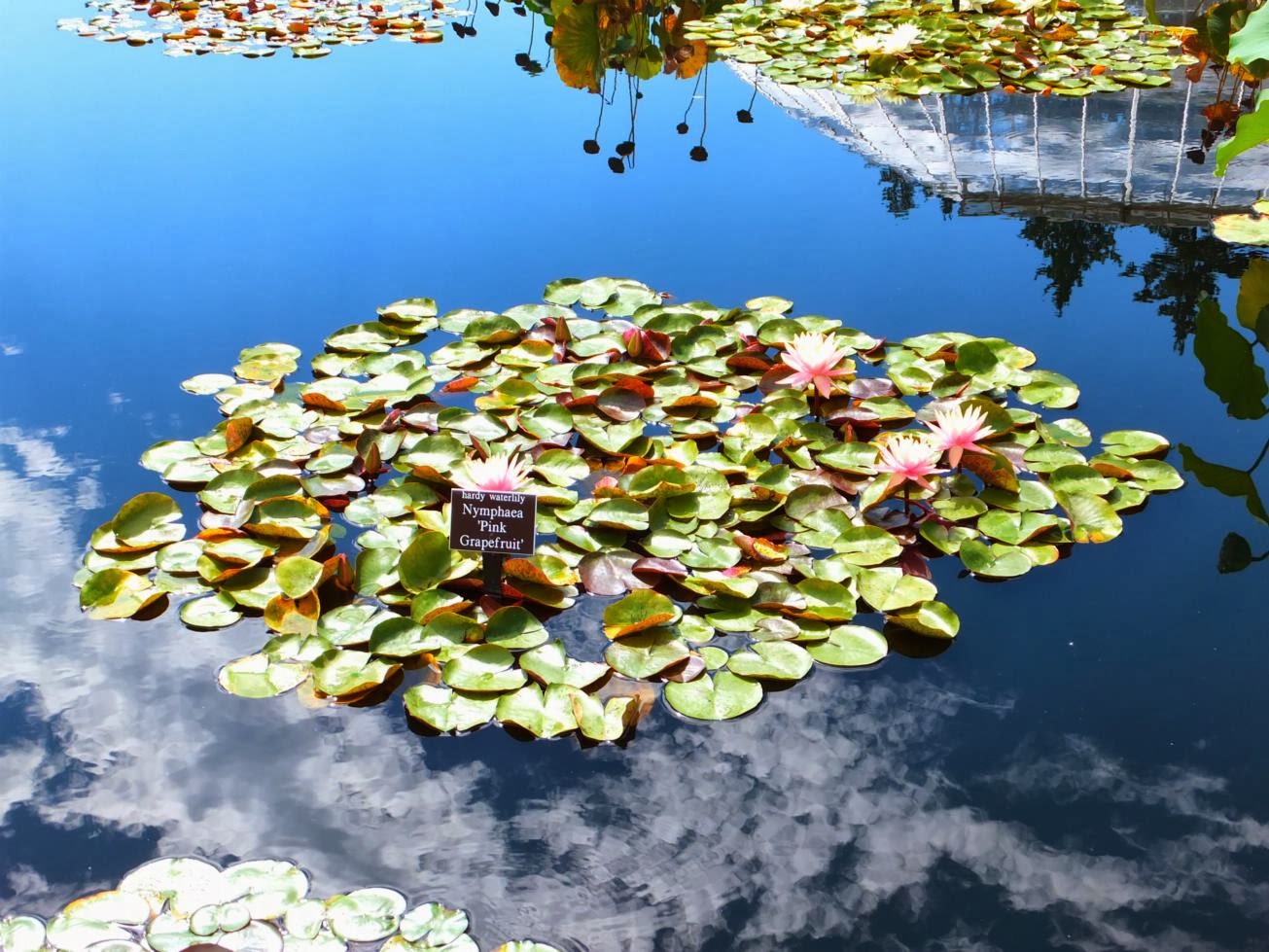 A good selection of Nymphaeas, Nelumbos, and even Victoria amazonica can be found growing in this pond and the effect of them all together looks splendid!