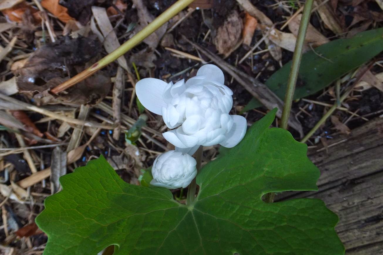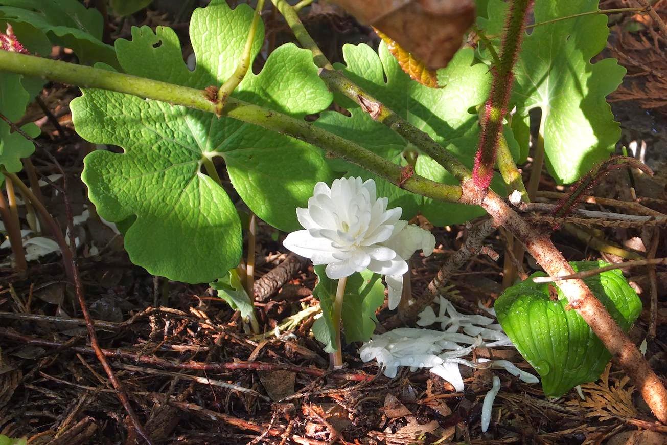 We grow Sanguinaria canadensis f. multiplex 'Plena' for it's relatively large and uniquely shaped foliage. But for a moment in the spring you get treated to the sight of their pretty white blooms too.