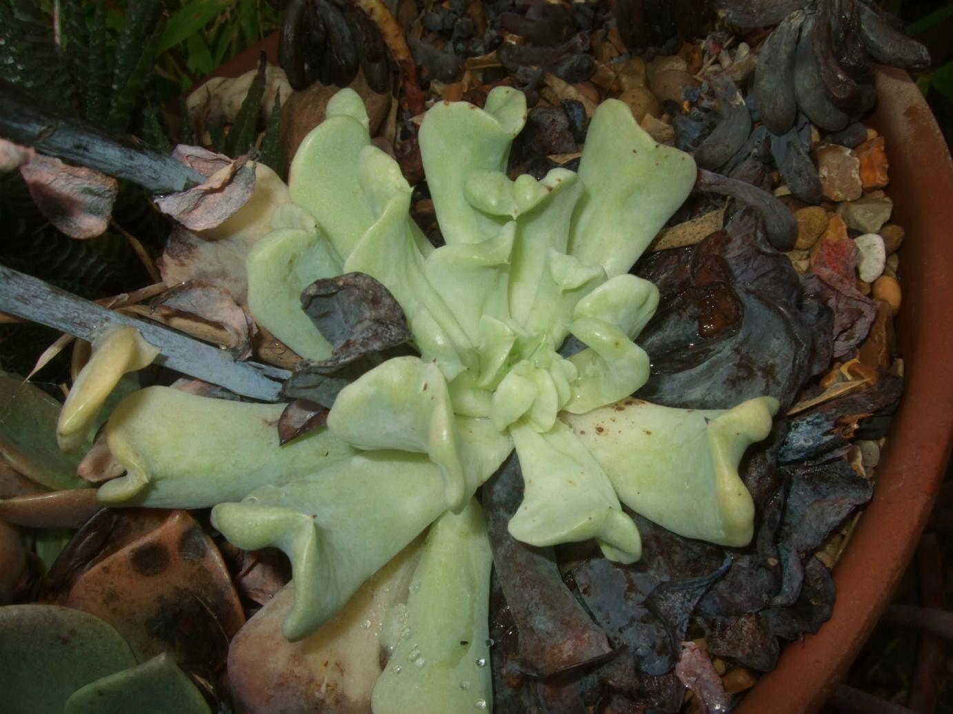 The Echeveria 'Topsy Turvy' is one of the hardier echeverias around and we used to have a patch of it, thriving and spreading out on a sunny and gravelled part of our garden and was never given any extra protection during winter. Alas winter 2010-11 was a very harsh one and it was only then that they perished. So it wasn't much of a surprise that this one on the dish is still looking mostly fine. I just hope the temps don't get any colder than it has been this winter already.
