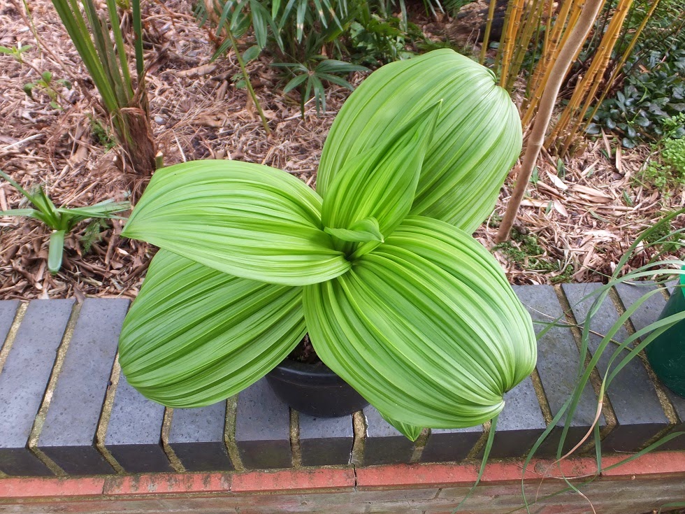 As you can see it is racing ahead in growth from the other potted Veratrums. These plants are prone to slug and snail damage, and it's not exactly living in the best of spots which made me admire this plant even more that it looked pristine.