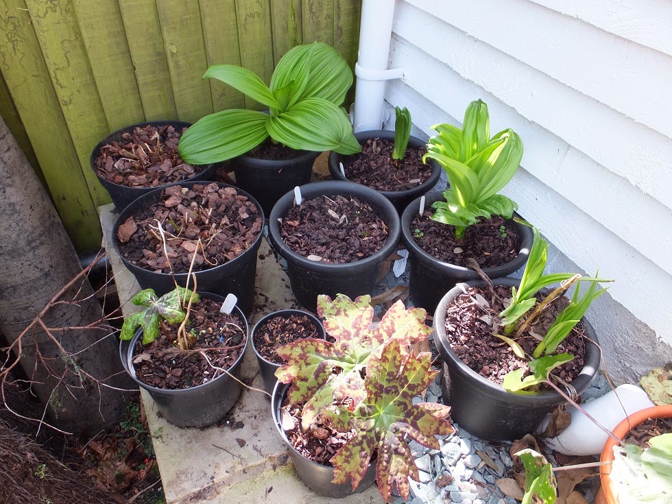 Most of our Veratrum collection are currently in our 'pot ghetto' - a place where empty pots and a few plants are stashed away until we've figured out what to do to them. It's not usually an area you'd want to show people around but I'm sure most gardens of reasonable size have this sort of space allocated somewhere.