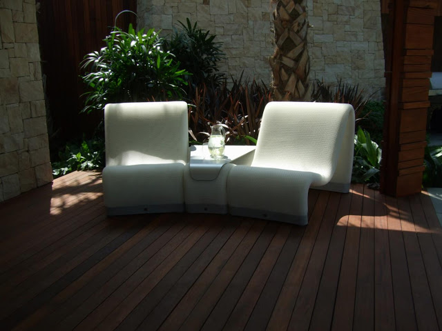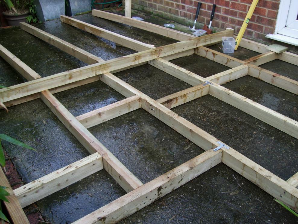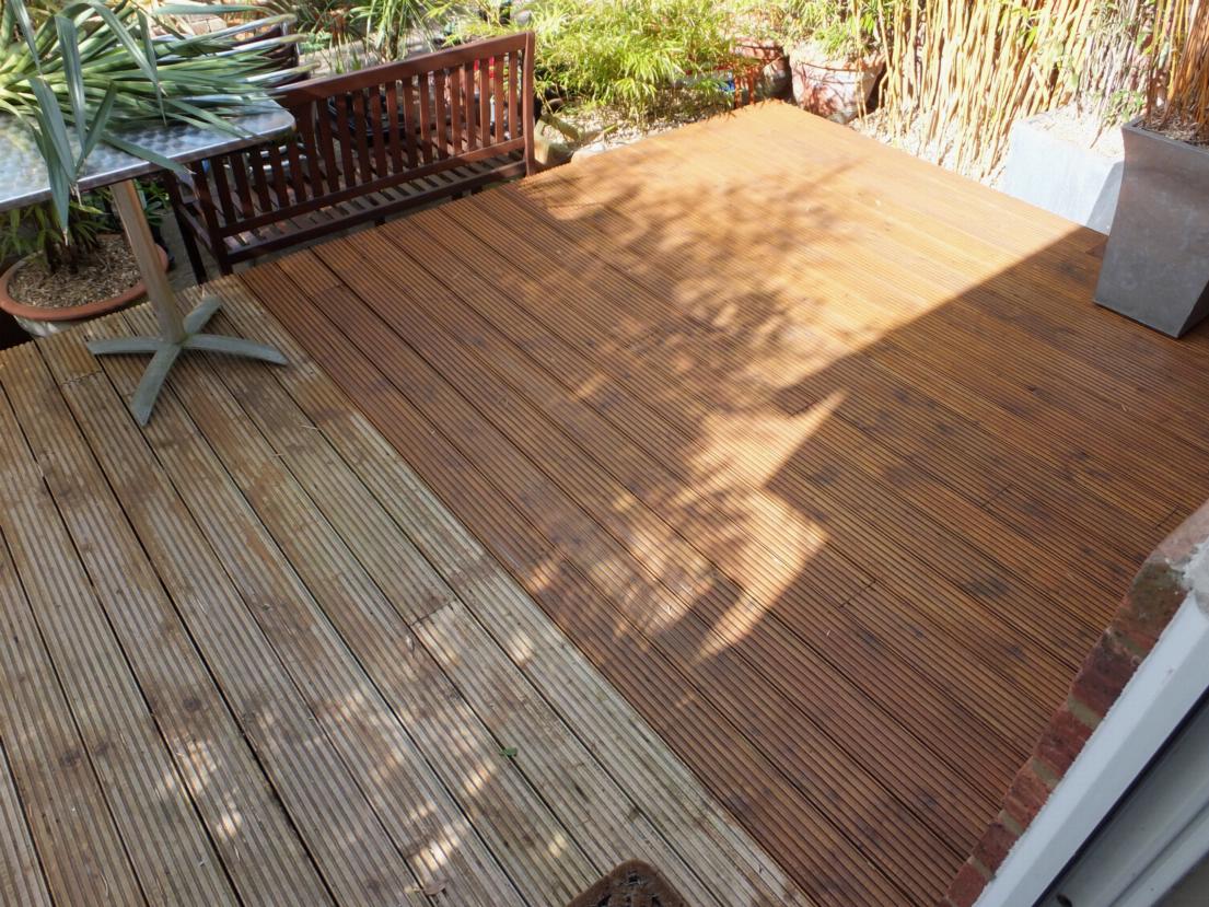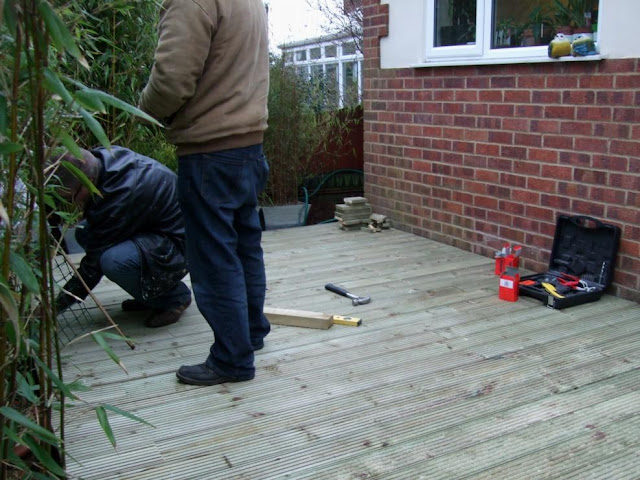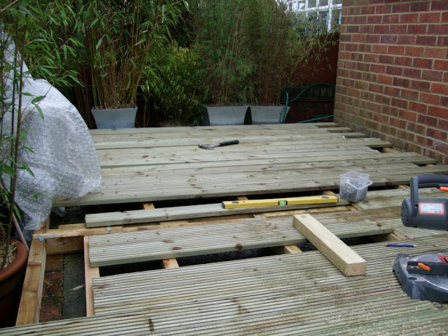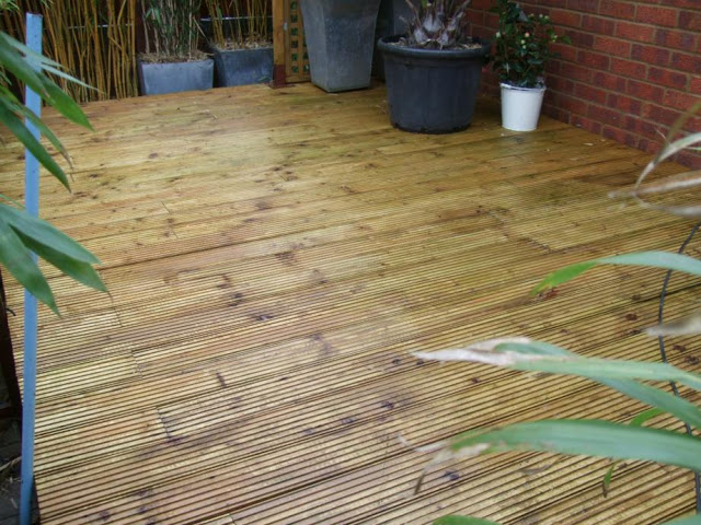 At the back of our house a former owner had planned to build a conservatory, but only got as far as having a concrete foundation laid. We never found out the actual reason why he didn't get any further, although various neighbours offered their explanations. However maybe one day we would add one ourselves. Regardless of the reasons, the bare concrete was not the most attractive feature to be confronted by as you entered the garden, so a few years ago we decided to cover it over, deciding that it would be too big a job to remove the foundation. We considered a number of options for what materials to use, perhaps matching the paving slabs used on the lower patio area adjacent to the concrete, or finding a stone of similar colour to the tiles on the kitchen floor to connect the two areas. However after weighing up the various possibilities we opted to lay a deck.