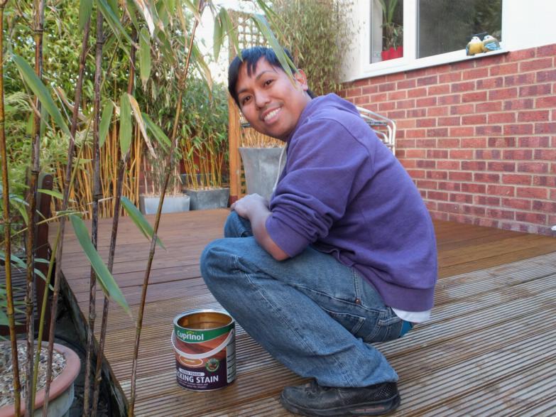 We had bought a 2.5l (0.66 US Gal) can of deck stain - opting to go for a good quality one able to cope well with the high level of foot (and paw) traffic across it. In theory this should have been more than enough but the bare and dry wood really did just drink up the paint so a second can was needed.