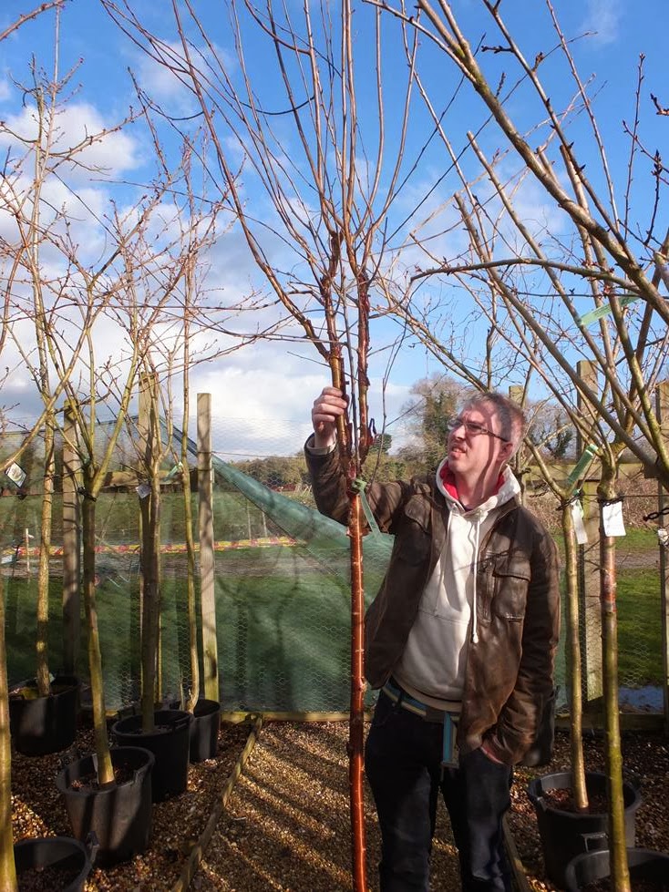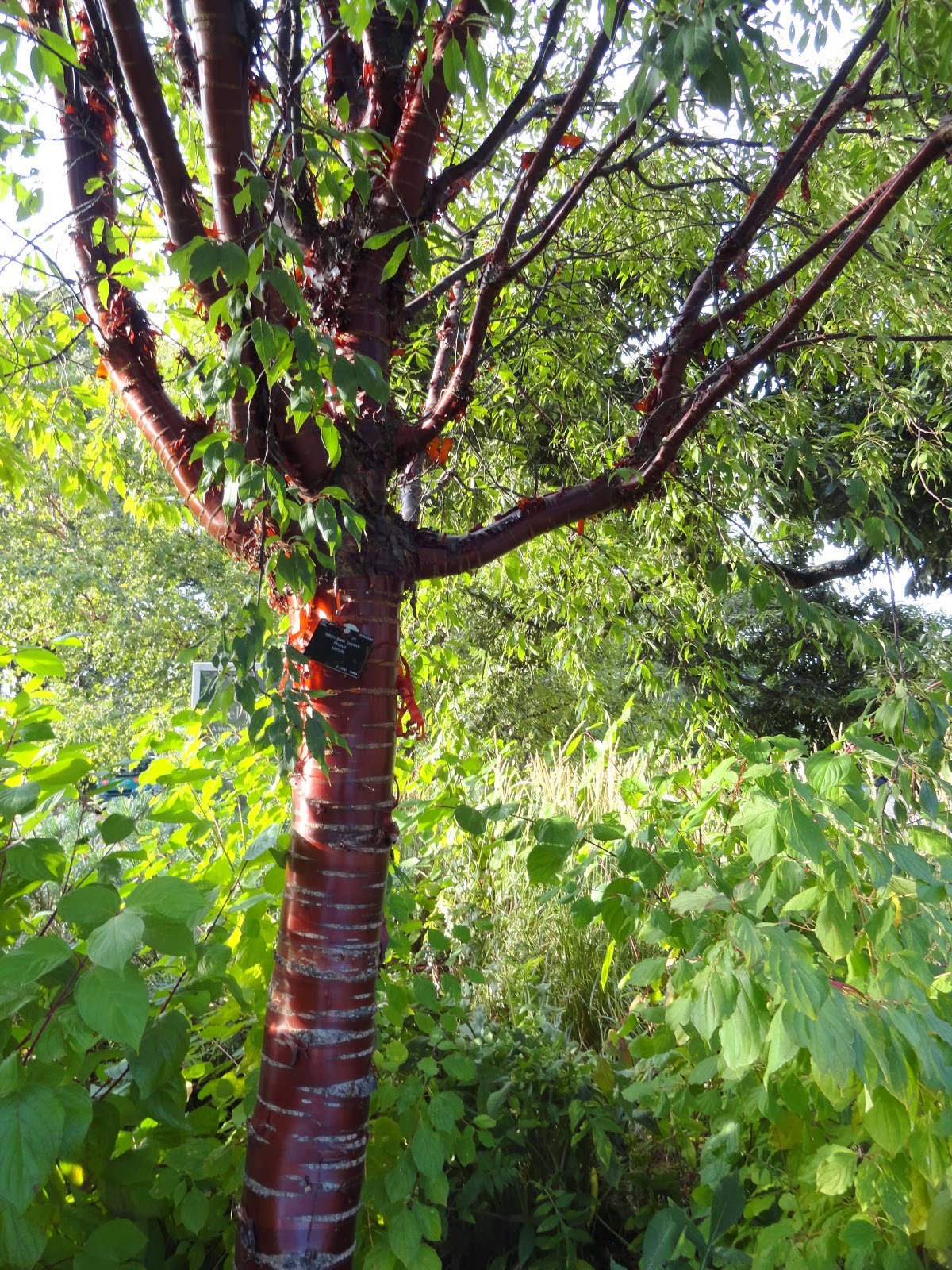 This is the Tibetan Cherry, Prunus serrula 'Tibetica', a tree introduced into cultivation by Ernest Wilson in 1908 from Western China and is one the finest trees available mainly for bark interest but its graceful habit, form, and not so large size are also notable features. The bark can be polished by regular hosing and even rubbing to further enhance its most attractive feature. There is a beautiful specimen of this that greets visitors to Kew Gardens via the Victoria Gate entrance and ever since we caught sight of this elegant tree it immediately went into our wishlist. And from last Saturday it finally leaped from our wishlist into reality and into our garden.