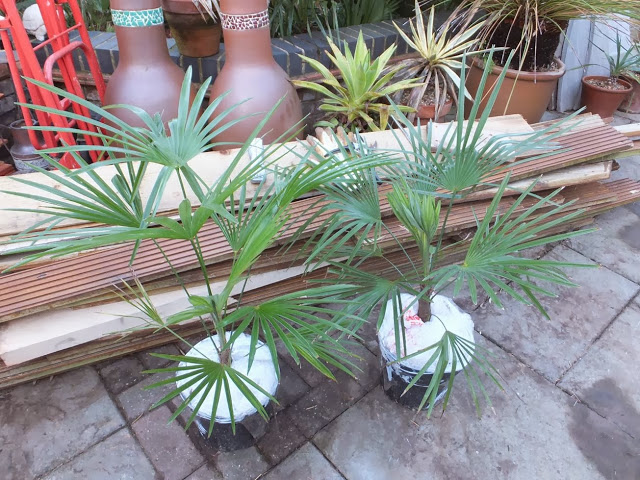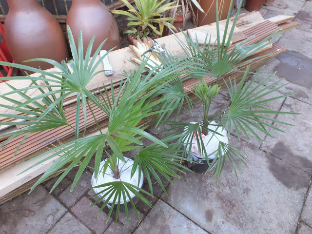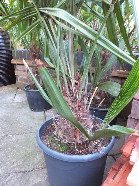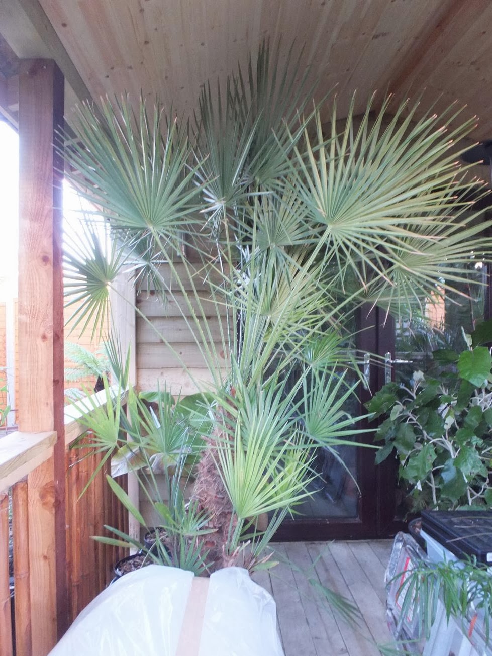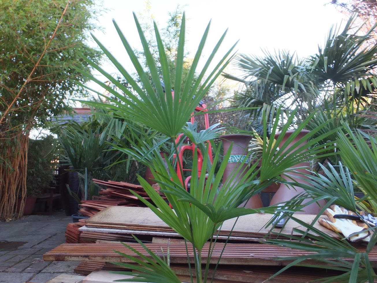 Apart from the Palm Centre we also recently bought a trunked Chamaerops humilis, the European Fan Palm and the only one native to this continent, in Crews Hill Gardening Club a few weeks ago. It is now taking shelter under the roof of the jungle hut verandah until it gets planted out.