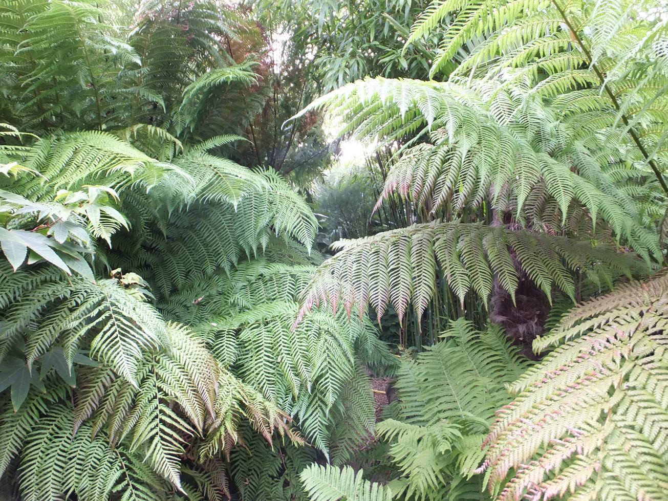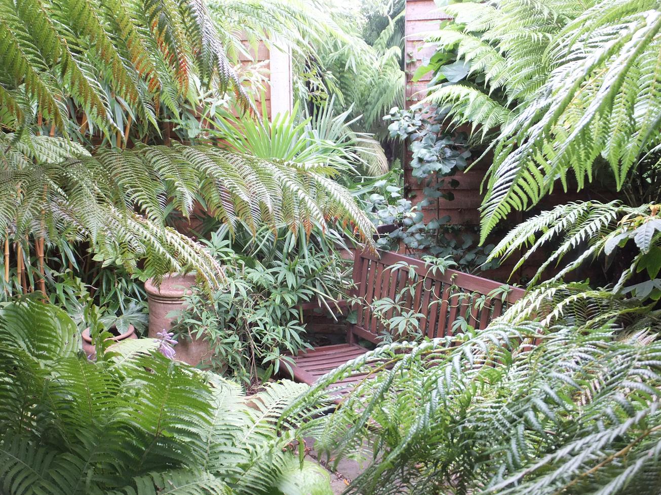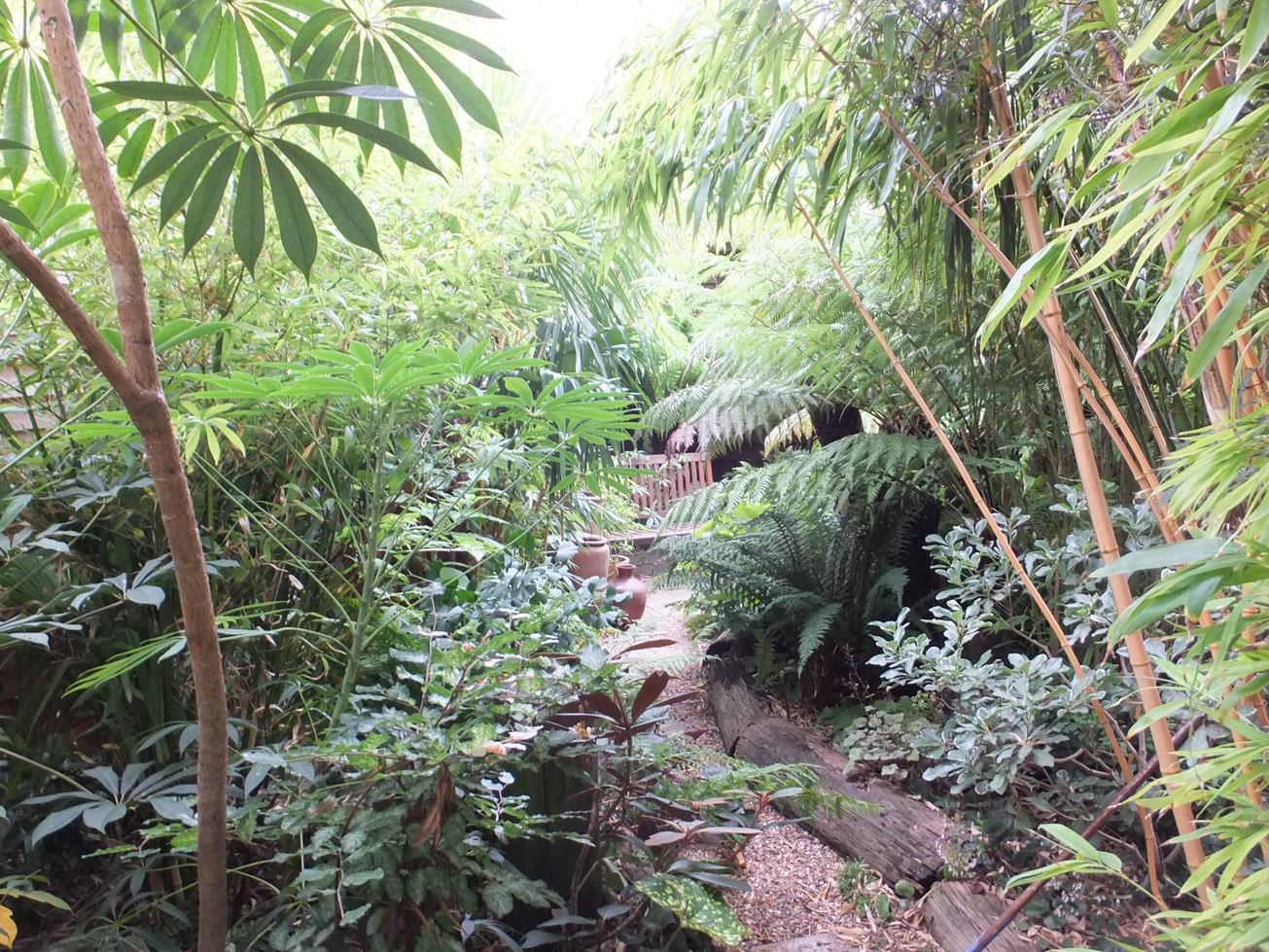 Near the palm above is our Gunnera tinctoria growing robustly and has already rooted over the pond coping stone to dip its feet directly on to the water, helping it grow even bigger and remain upright.
