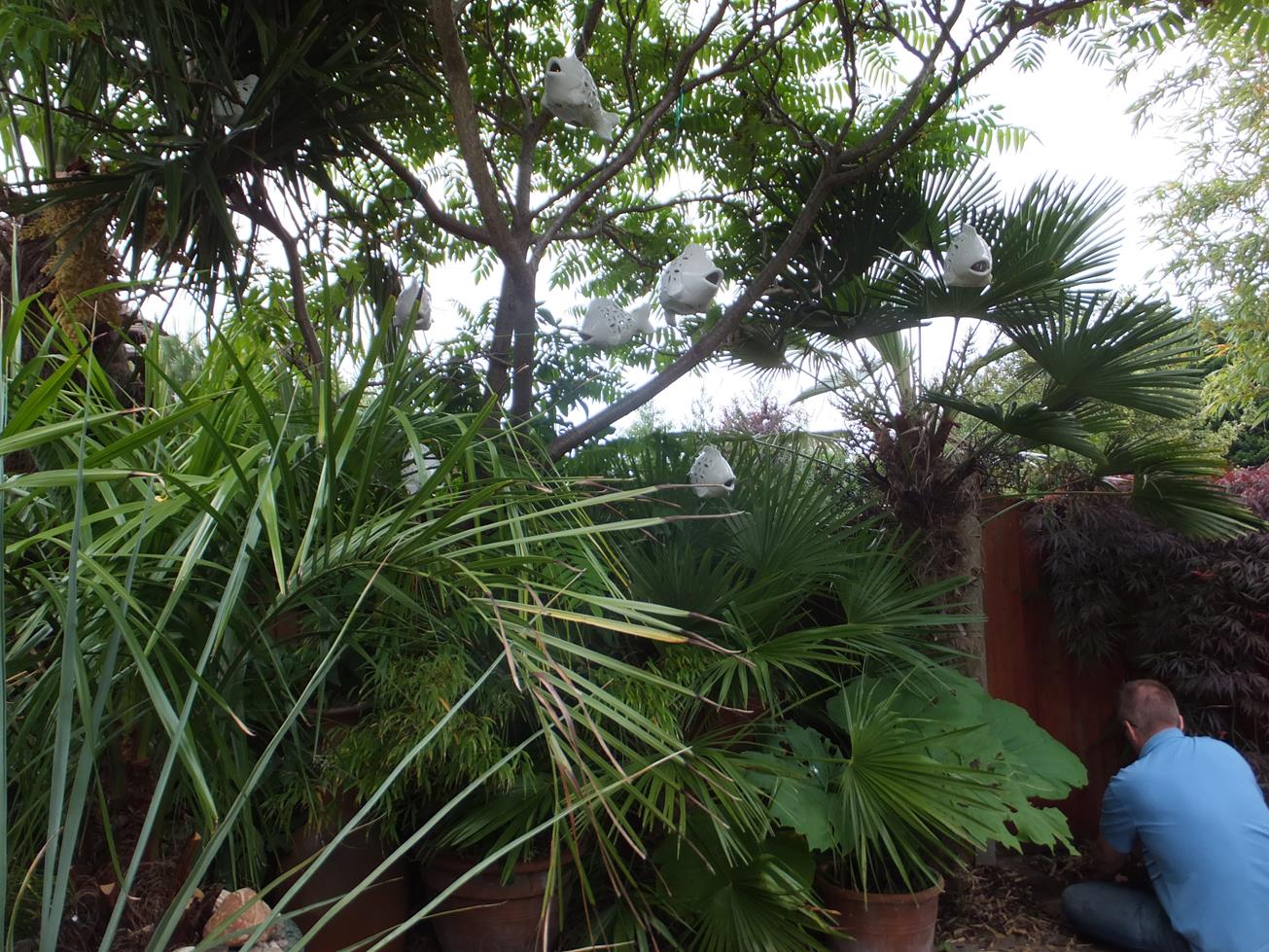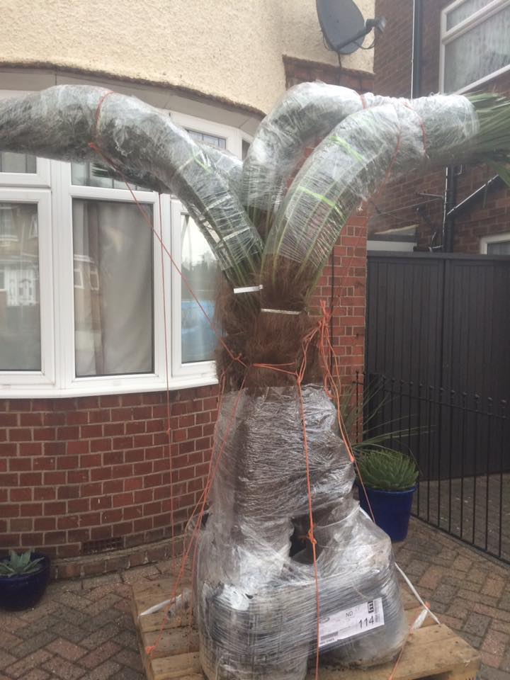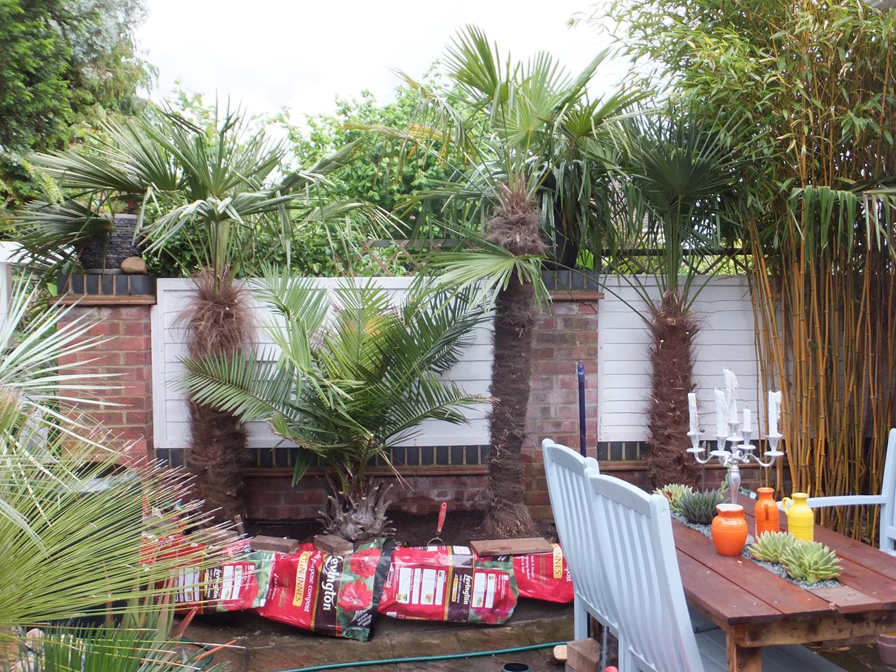 First in was one of the four tall trunked Trachycarpus fortunei we bought earlier in the year to improve the screening.